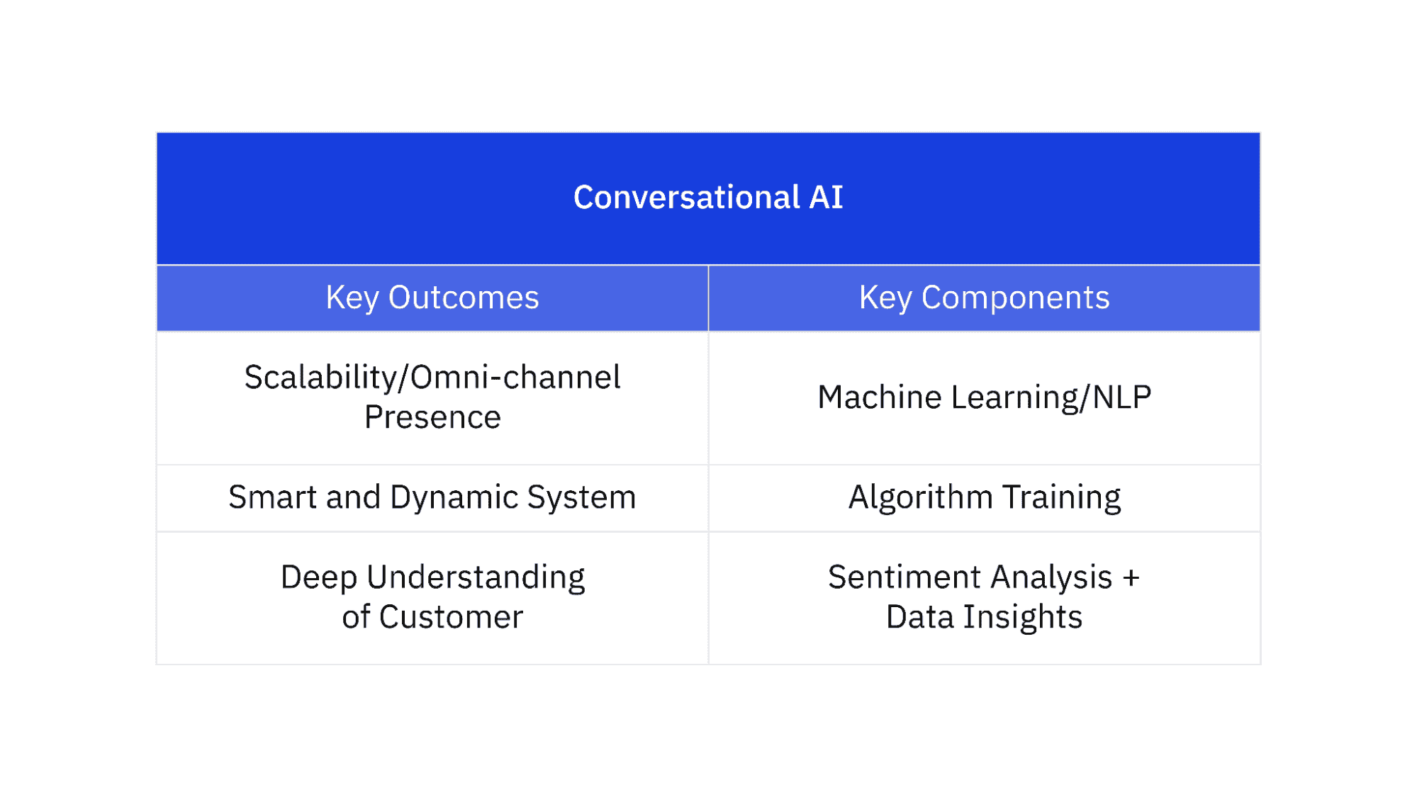 Where a traditional chatbot is like an alarm clock that can be set to wake you up at a certain time, with a preselected ringtone, or even on a consistent schedule, an AI chatbot can be compared to a more advanced application that monitors your sleeping rhythms, can determine what phase of sleep you’re in, and thus wake you up at an optimal time. This analogy may be a bit of a stretch, but at the core is the same idea - the latter is a highly advanced version of the former, utilizing complex processes such as machine learning, NLP, NLU (natural language understanding), deep learning, and predictive analytics to deliver a truly unique and personalized experience for the user. Whilst the first option may seem like it accomplishes enough on its own - it can track orders and provide customers with answers, after all - a conversational AI adds a layer of complexity that can be a truly cost-effective alternative to agent-driven conversations. It can understand intent, context, and sentiment, and then use the platform to provide human-sounding replies that drive the interaction forward. You can take a look at some of the key components and outcomes of an AI chatbot below.