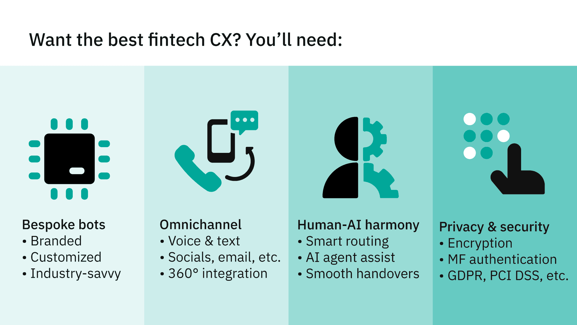 The difference comes down to partnering with CX experts who truly understand how fintech chatbots fit into the holistic set of strategies and services you need to skyrocket satisfaction and scale. This includes your overall customer journey as well as your business’s position, market, and ambitions. Ensure that your specialists, as well as your team, are clear on the best practices that unleash virtual assistants’ full potential across loyalty, efficiency, security, and revenue. The takeaways?