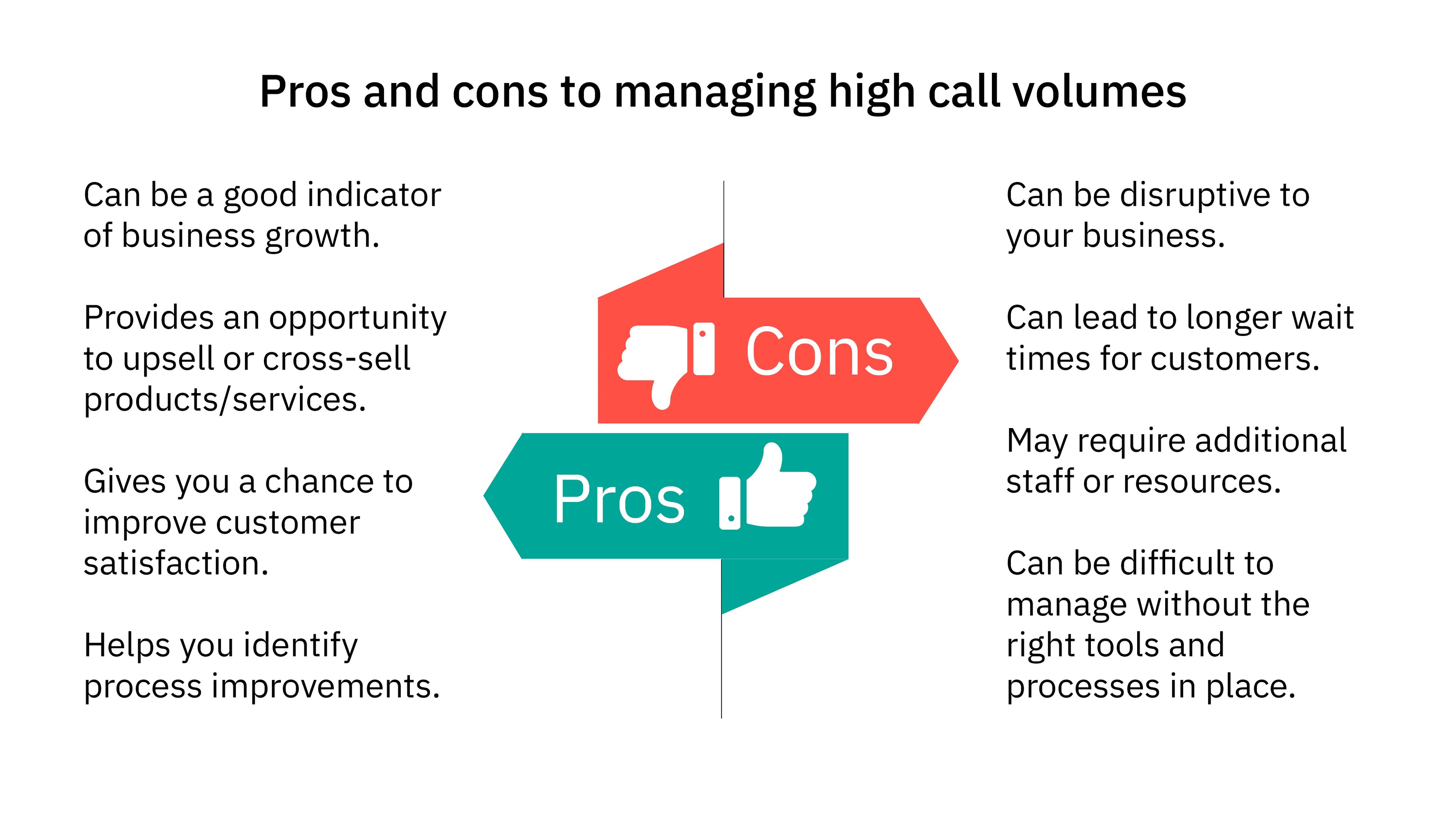 Though it may seem like managing high call volumes is an uphill battle, there are two sides to the story. There are a few pros and cons to consider, such as: