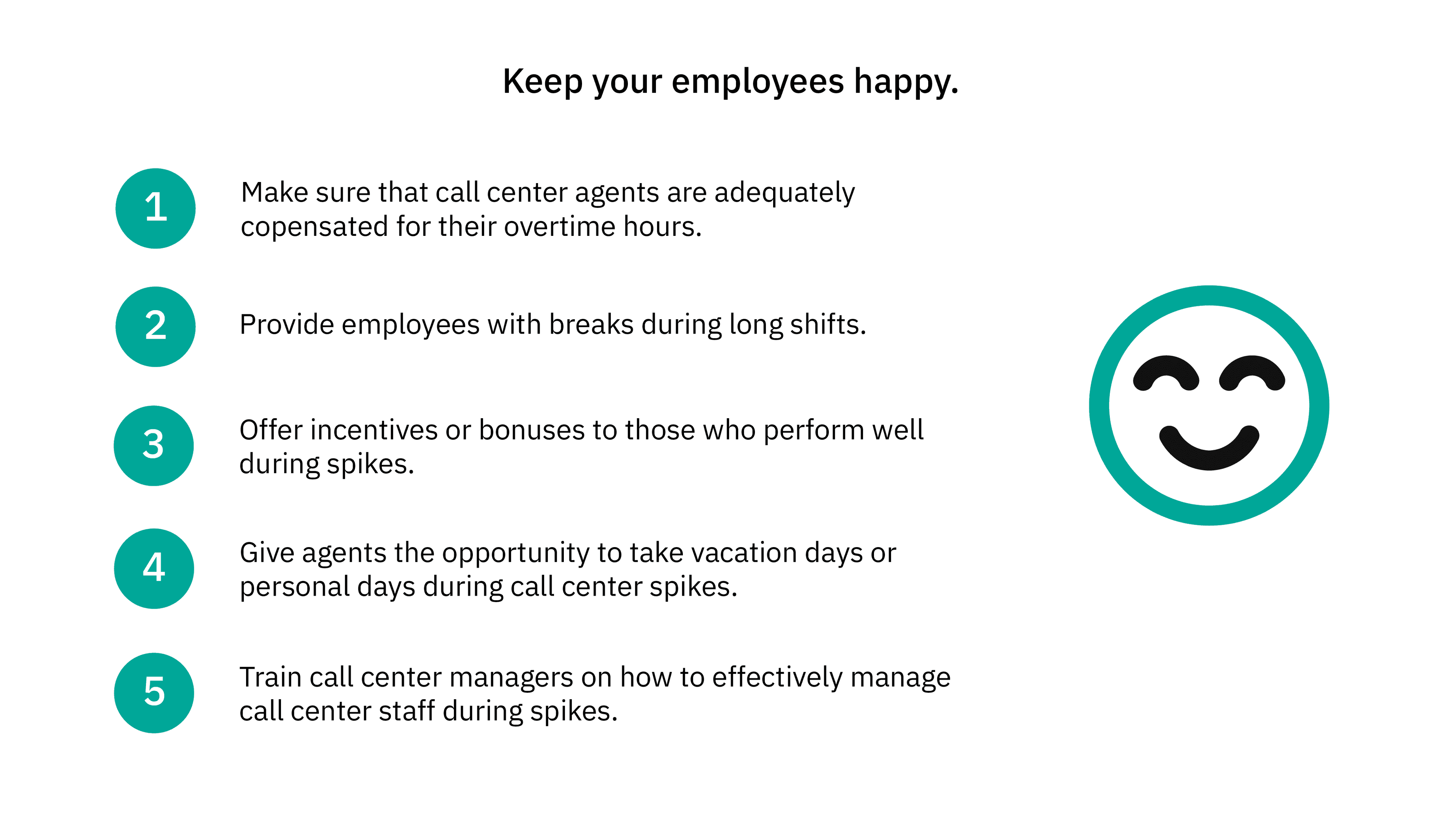 Keeping your employees happy during call center spikes is crucial, as this is a stressful time for them as well. Here are some tips for managing call center staff during spikes:
