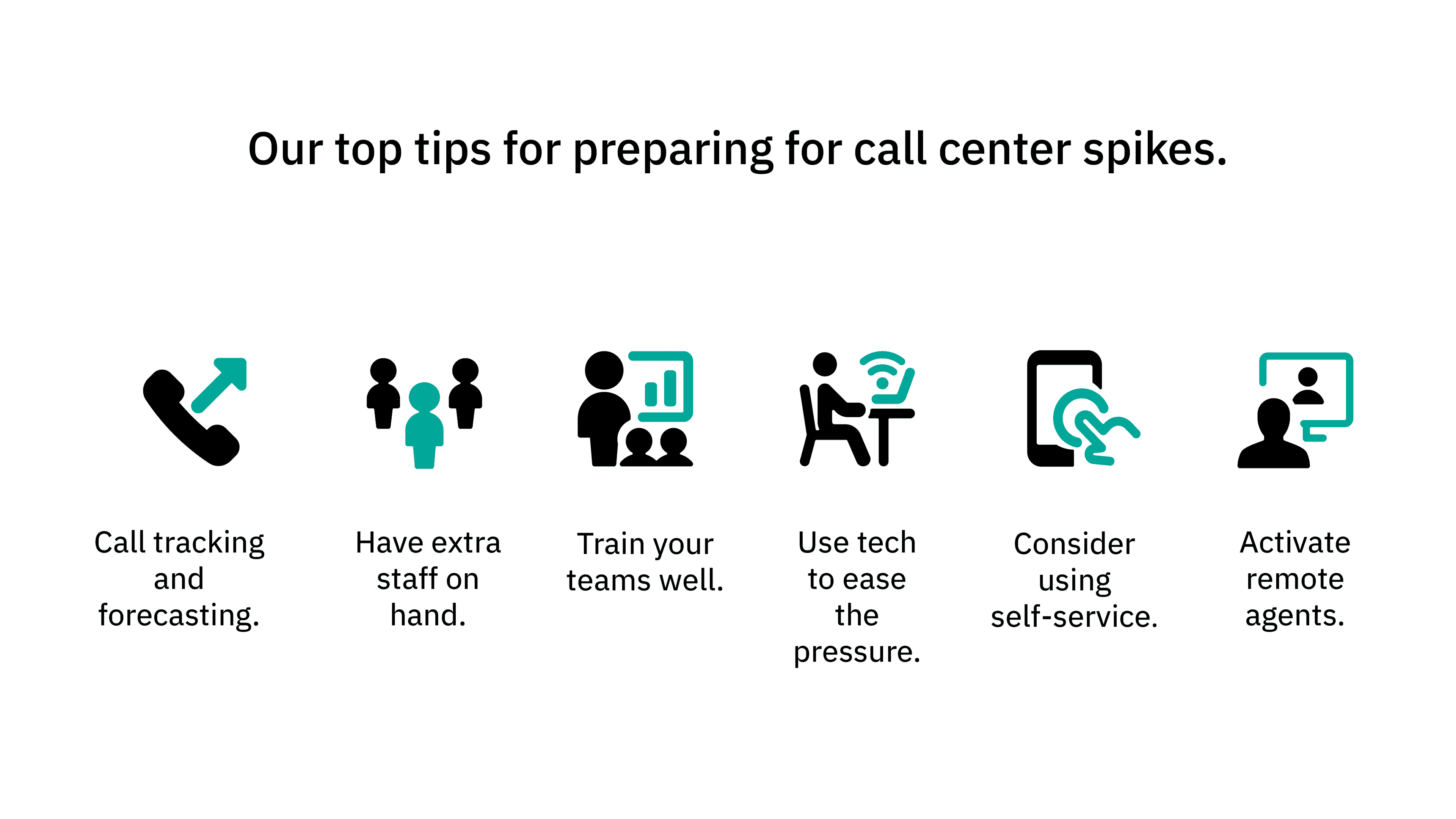 From having extra staff on hand, using data to predict call volume spikes, to effective training of your teams, there’s a multitude of ways you can prepare for sudden increases in inbound calls. We’ve summarized them for you below.