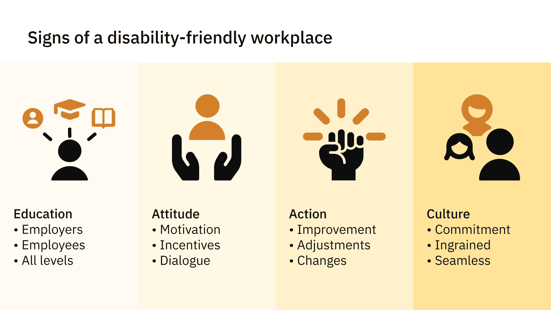 All of this leads to the ultimate goal of diversity and inclusion for people with disabilities, and that is a company that has those values at its very core. When a company really prioritizes these principles, it permeates every aspect of its culture. The physical accessibility, the educational opportunities, and the proactive initiatives all become natural extensions of an underlying philosophy. The moment inclusion and being disability-friendly become second nature to employer and employee alike, without them having to actively think about it, that's when we've achieved a great work environment.