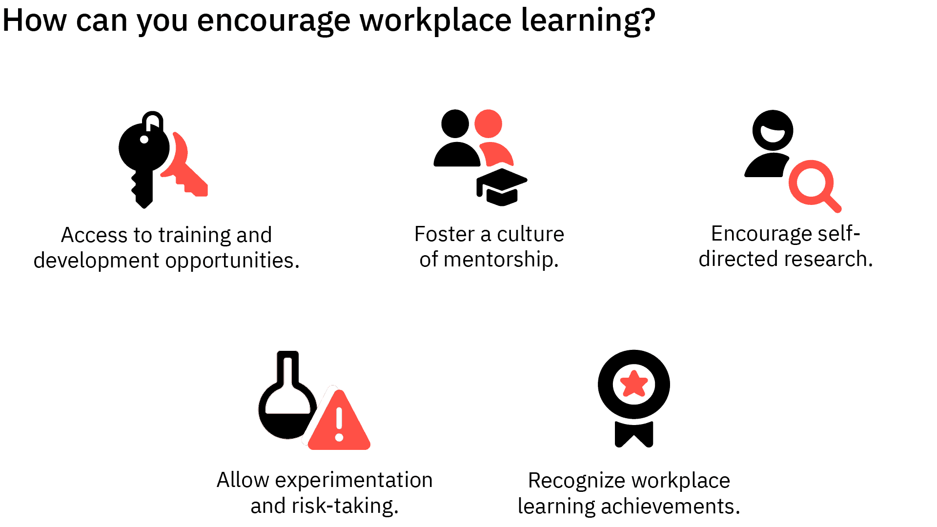You can divide this area broadly into two categories: formal and informal workplace learning. Formal learning includes activities such as training courses, mentorship programs and certifications. Informal initiatives involve activities such as on-the-job experience and self-directed research.