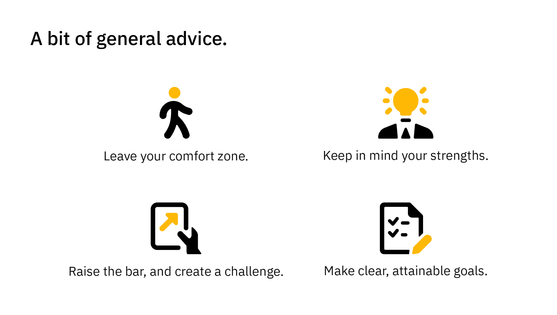 While finding the new and exploring your weaknesses is great, you shouldn’t ignore your strengths. They are what makes you ‘you’ and you should always strive to improve them or to use them in new ways.