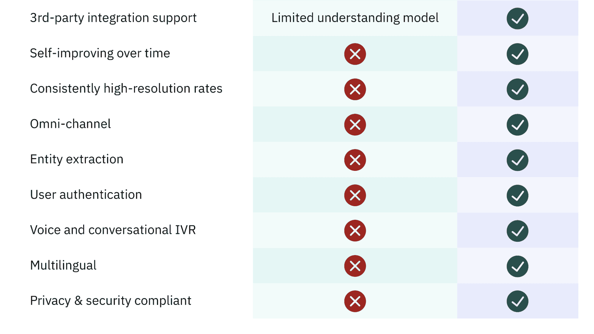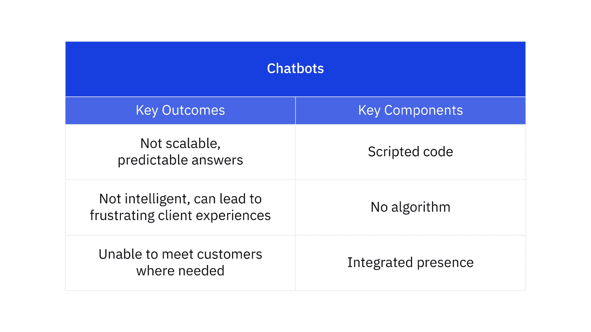 Traditional bots, or even bots that have been augmented with NLP or machine learning elements, carry certain benefits (and challenges) with them as well. You can see a summary of the key components and outcomes below.