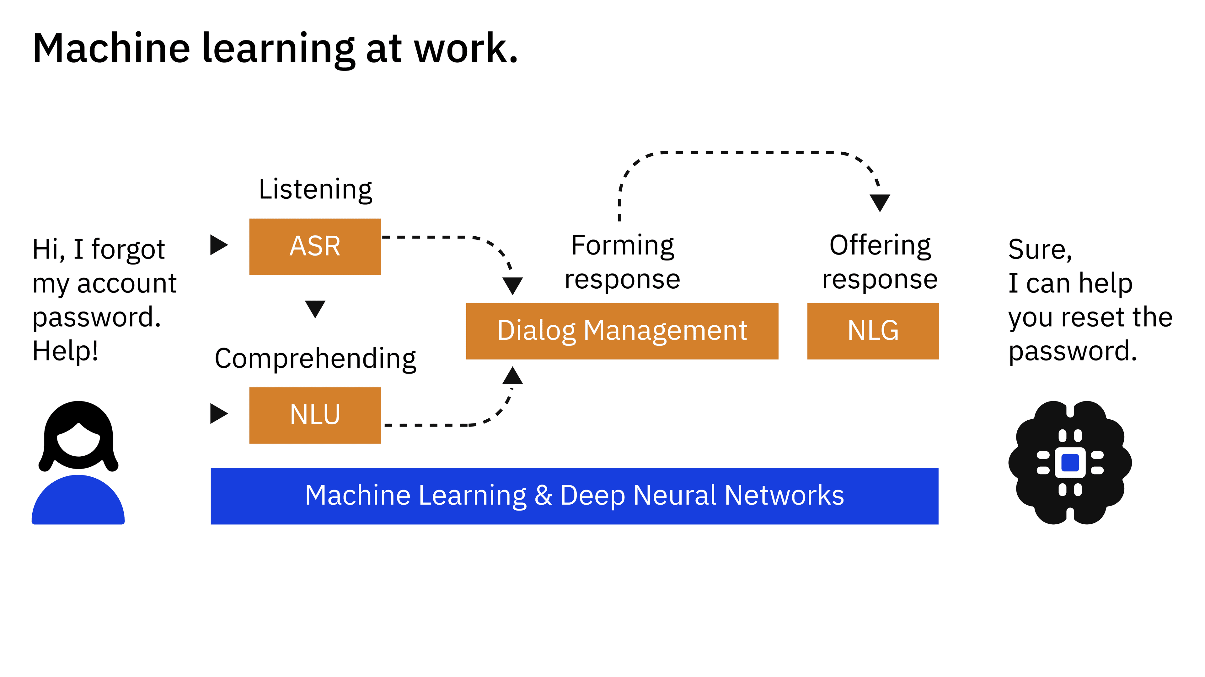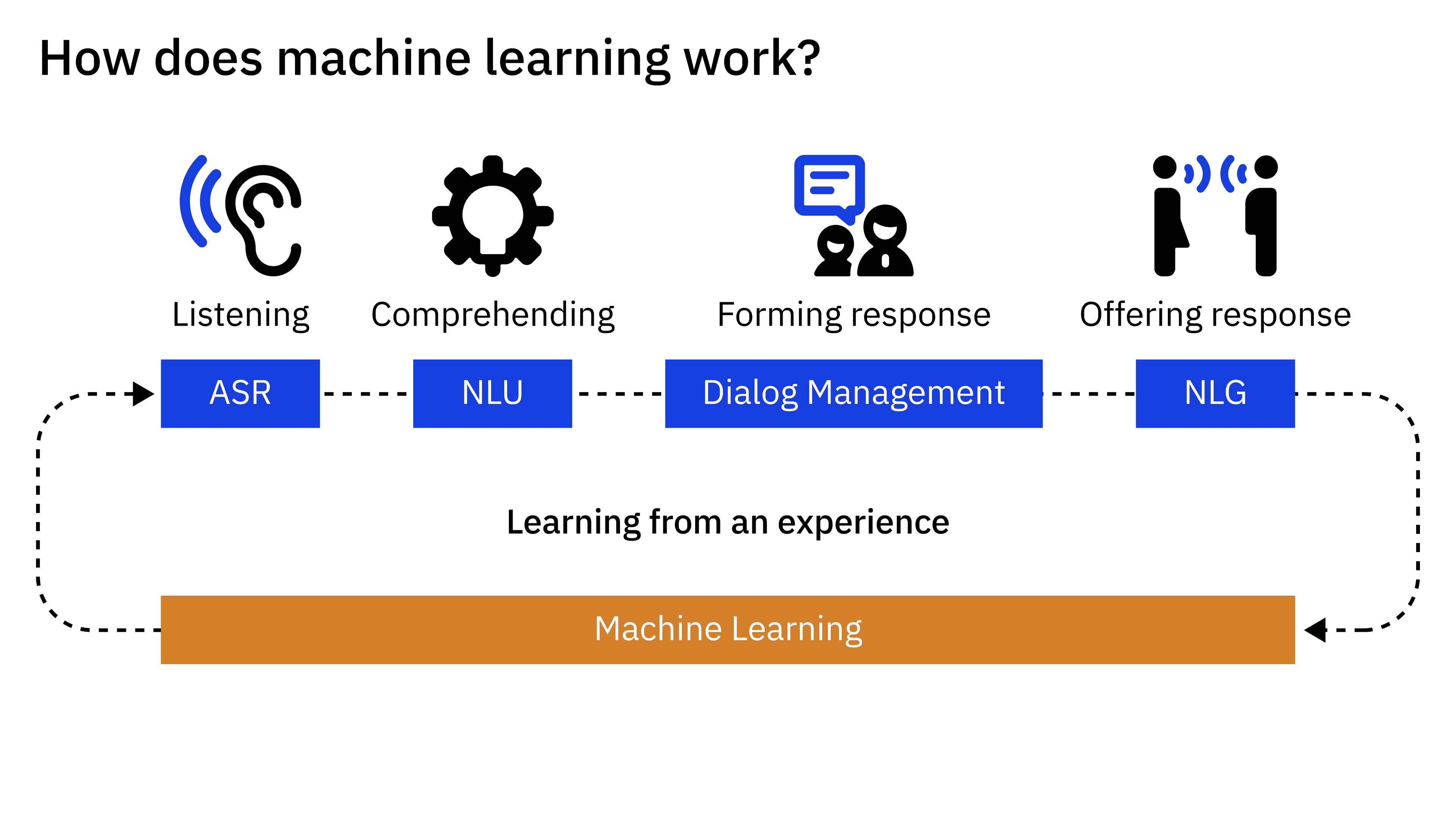 This technology is powered by artificial intelligence, natural language processing (NLP), and machine learning. Each of these three components must be present for a true conversation solution to be feasible, and they each of course contain their own fields of learning and solution stacks. Together, these technologies enable conversational AI applications to understand human language, respond in a natural way, and learn from experience to improve over time.