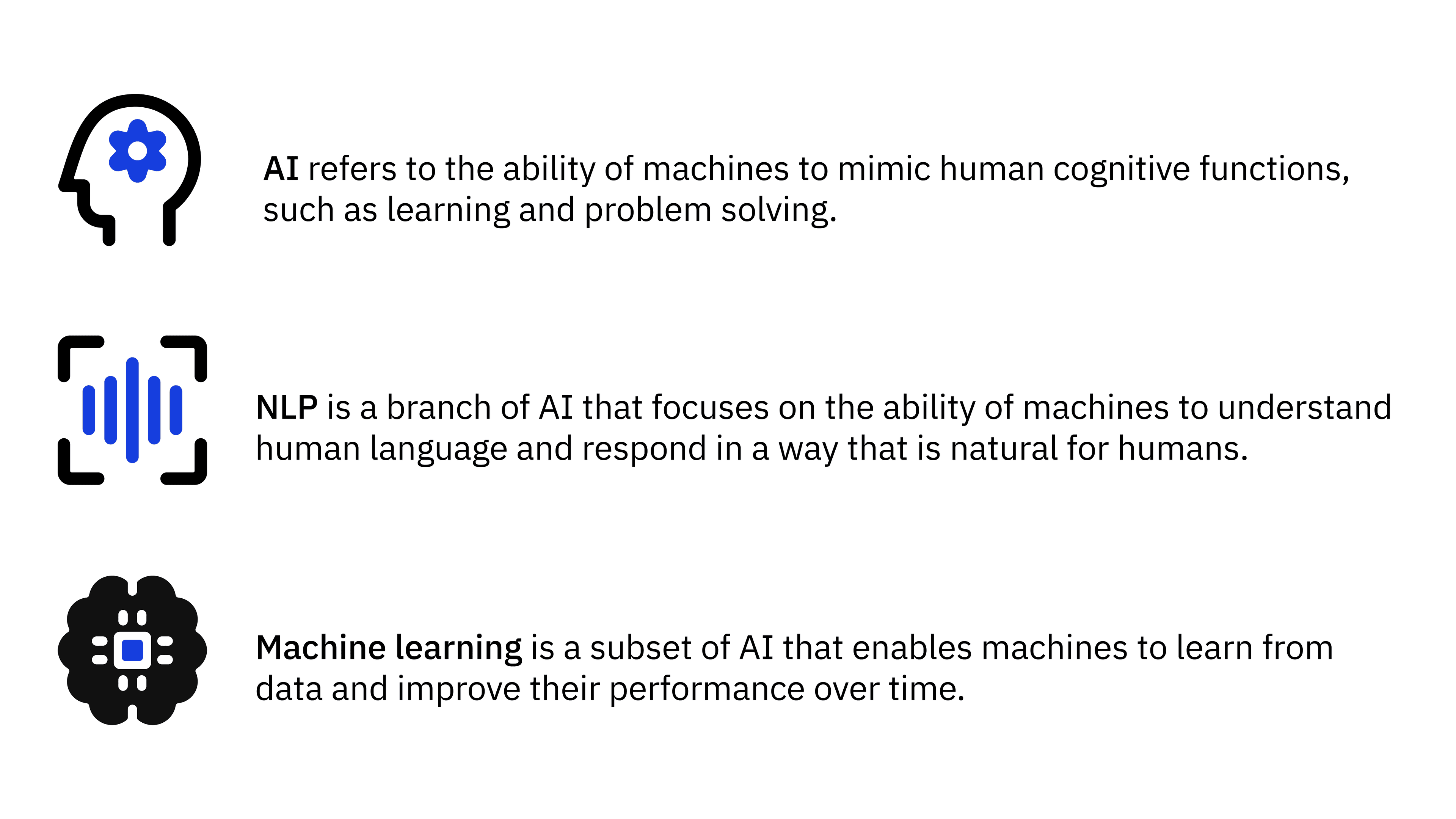 Artificial intelligence is a broad term that refers to any computer system that can perform tasks that ordinarily require human intelligence, such as visual perception, natural language processing, and decision making.