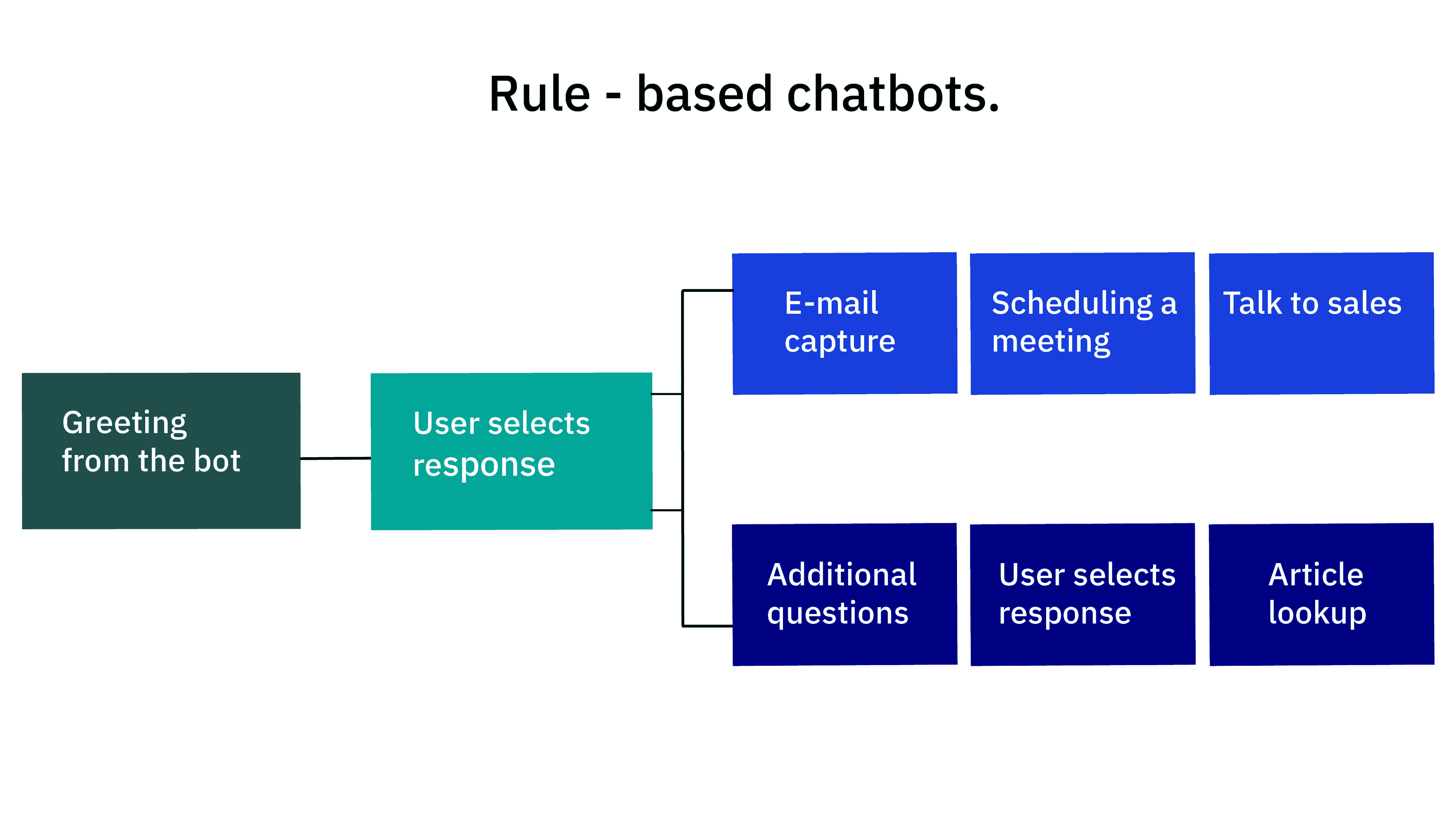 These operate on a predetermined set of rules and are not able to understand human conversation. They tend to work based on a series of predetermined questions that are programmed to recognize specific answers, complete basic tasks, and present fixed options for users.